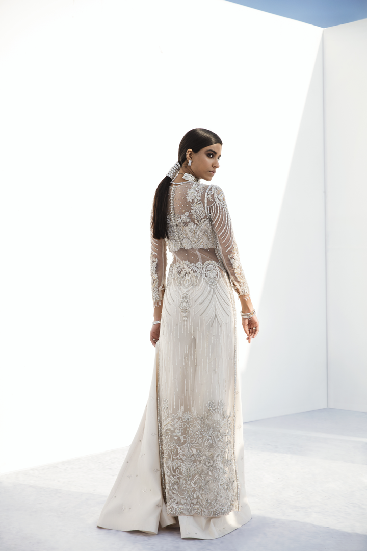 Beautiful white net shirt with crystal and beaded handwork through. Comes with a long cotton silk sleeveless under slip that covers the stomach. Paired with silk flayed embroidered sharara pants.