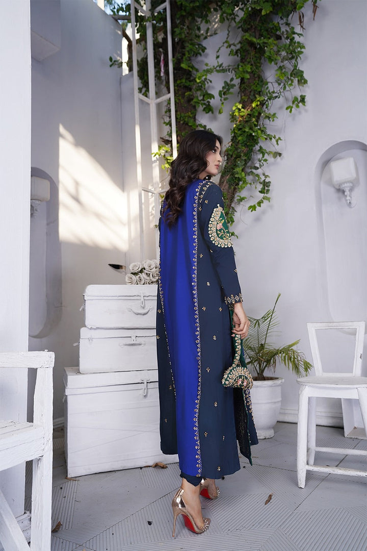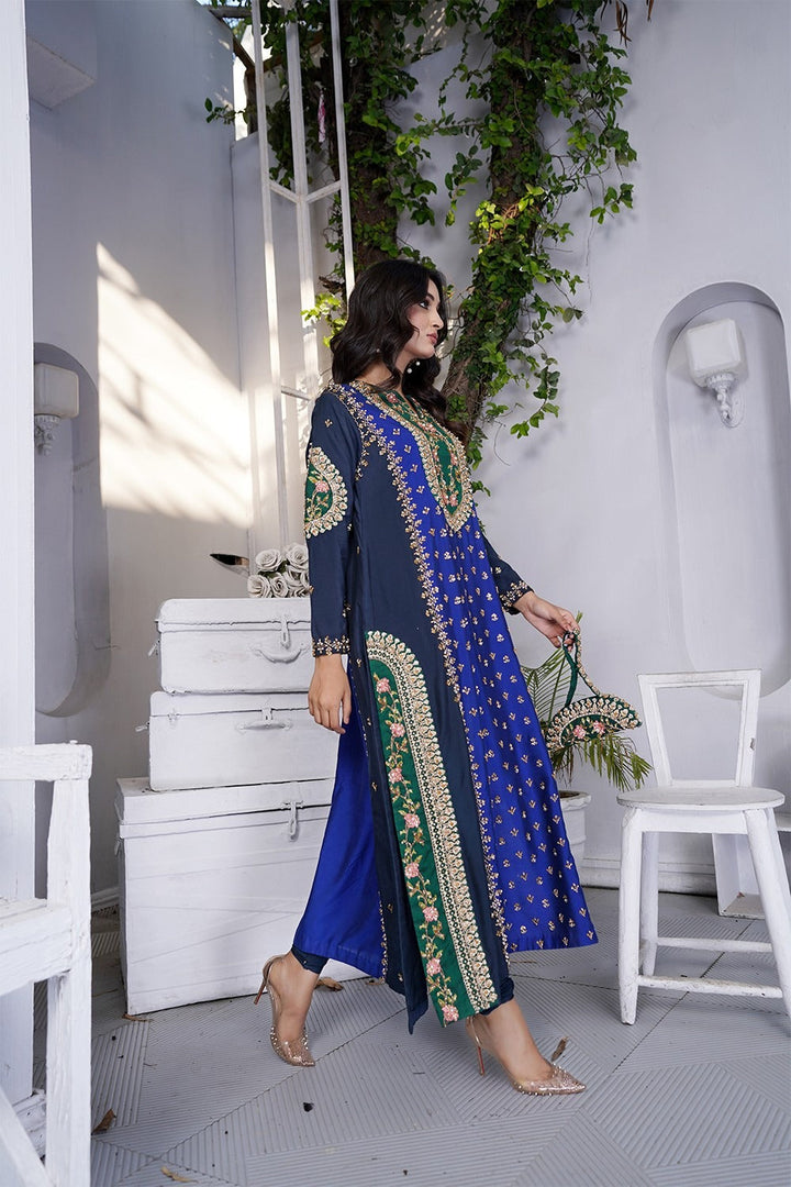 A long shirt of floral fusion is embossed with zardozi, crystals, tilla, pearls and thread work, the color blocking of this elegant silhouette makes it a piece of art. It is paired with a churridar lower.