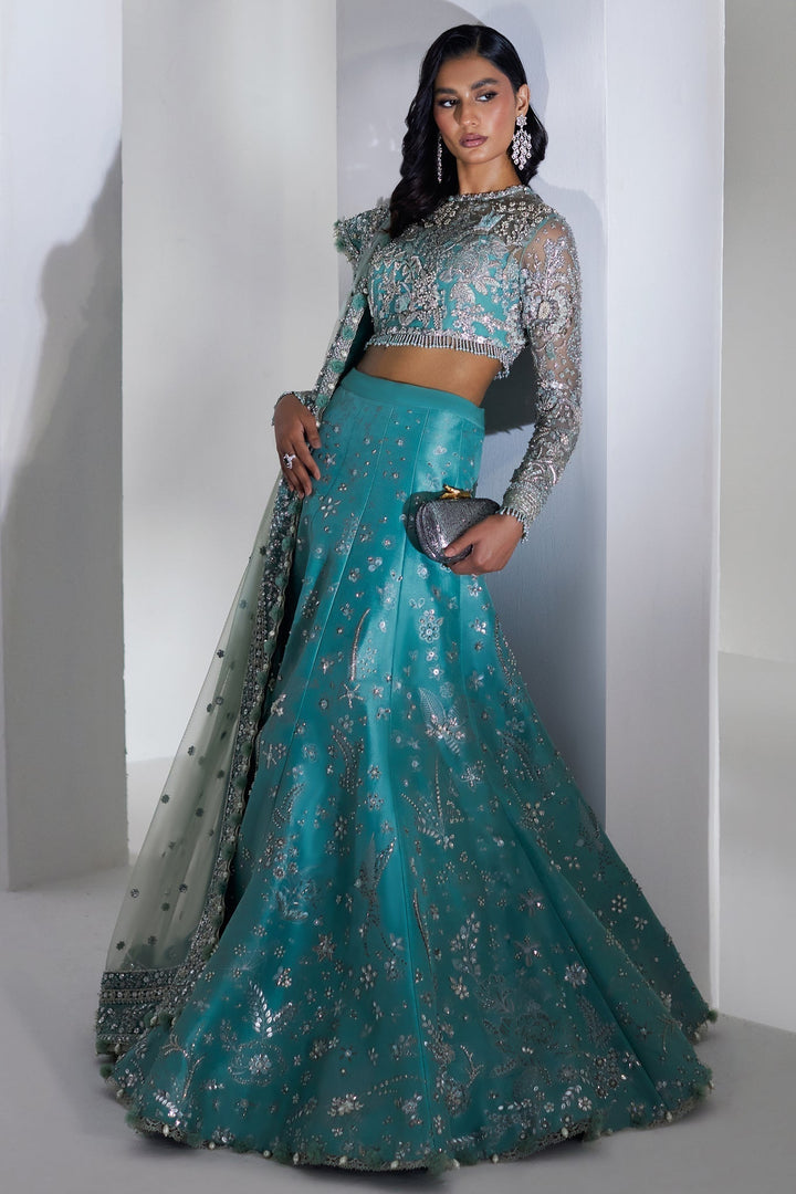 Ethereal and breathtaking, Élan luxury pret enchants with its mesmerizing romantic allure and celestial charm. The 'Étincelle de cristal' ensemble showcases luxurious fabrics in ethereal, dreamy hues, adorned meticulously with intricate hand embellishments, luminous pearls, and dazzling Swarovski crystals, all enhanced by Quintessential Élan tassel details.
