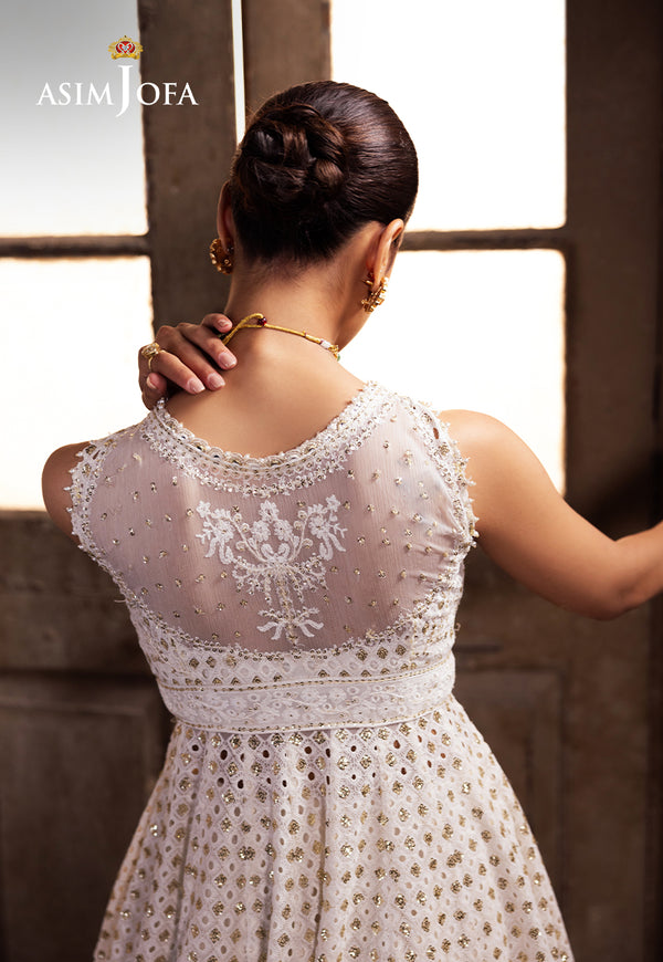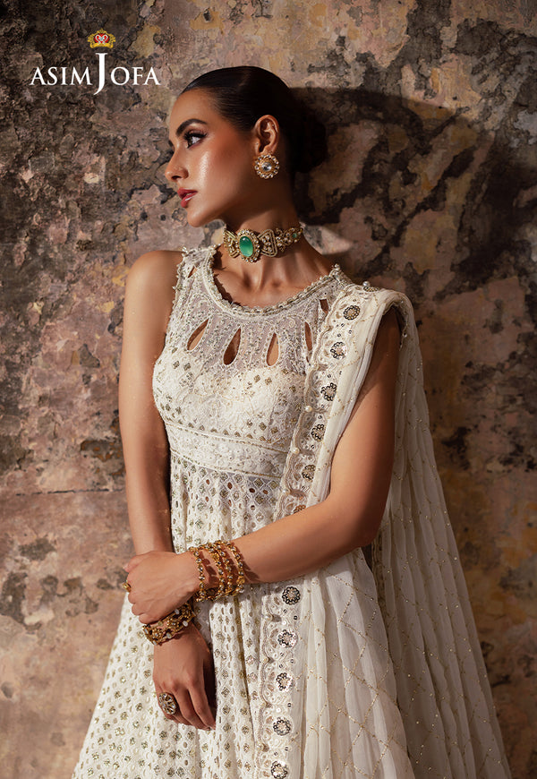 This ivory Peshwas is a canvas of opulence, a whisper of sophistication that dances in the light. Embroidered with ivory threads, it weaves a story of grace, while light gold cupped sequins shimmer like scattered stardust, adding a touch of magic to the ensemble. Crafted with a "boring" technique, it boasts a unique cutwork effect, reminiscent of ancient architecture. Paired with a beautifully embroidered dupatta, a masterpiece that envelops the wearer like a gentle breeze, creating an aura of ethereal beauty that lingers in the hearts of those who behold it.