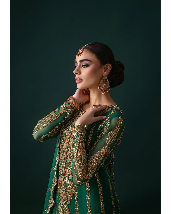 A celebration of refined luxury, this ensemble blends deep emerald hues with ruby accents and subtle gold-dusted detailing. Crafted from premium chiffon, the shirt flows with effortless grace, complemented by tailored contrast pants. The look is elevated with a diagonally embroidered dupatta, finished with delicately scalloped borders.