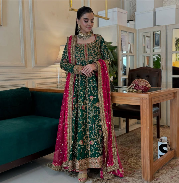Step into timeless elegance with the Haris Shakeel Green with pink Embroidered Formal Dress. This breathtaking ensemble features a richly embroidered Green base adorned with intricate floral patterns in vibrant hues. The outfit is paired with a beautifully designed matching dupatta, bordered with fine embroidery that enhances its luxurious appeal. Perfect for weddings, evening soirées, or festive gatherings, this masterpiece embodies a seamless blend of tradition and contemporary sophistication. Crafted to perfection, Haris Shakeel's design ensures you stand out with grace and charm.