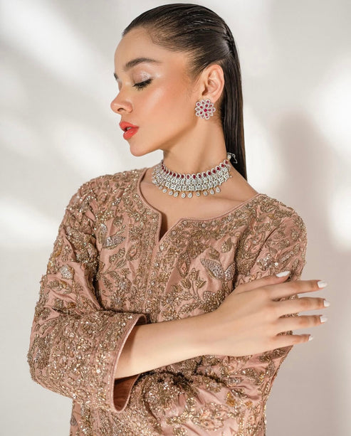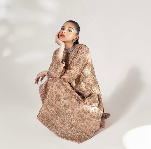 Inara by Honey Waqar is a breathtaking ensemble that exudes elegance and sophistication. Crafted with luxurious fabrics and adorned with intricate embellishments, this masterpiece reflects the signature artistry of Honey Waqar. Delicate embroidery, rich textures, and a harmonious color palette come together to create a look that is both timeless and regal. Perfect for special occasions, Inara is designed for the modern woman who appreciates tradition with a touch of contemporary finesse.