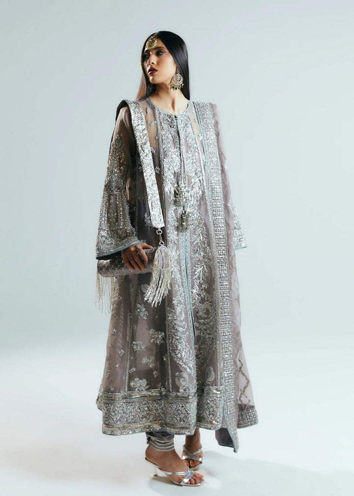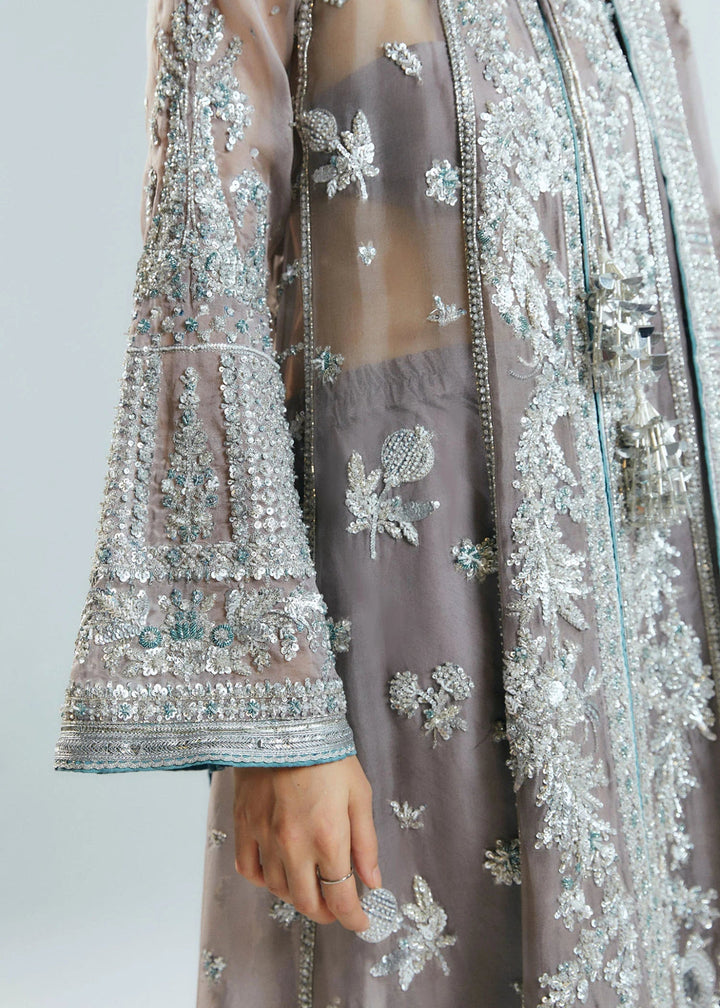 A perfect illustration of dazzling hues features stunning Grey organza Jacket composed with three different panels on each side. Each panel is embellished with intricate handwork details of sequins,bugle beads along with korean rawsilk choridar. Paired with a detailed embroidered organza dupatta enhanced with intricate handwork details on four side border, setting a timeless appeal.