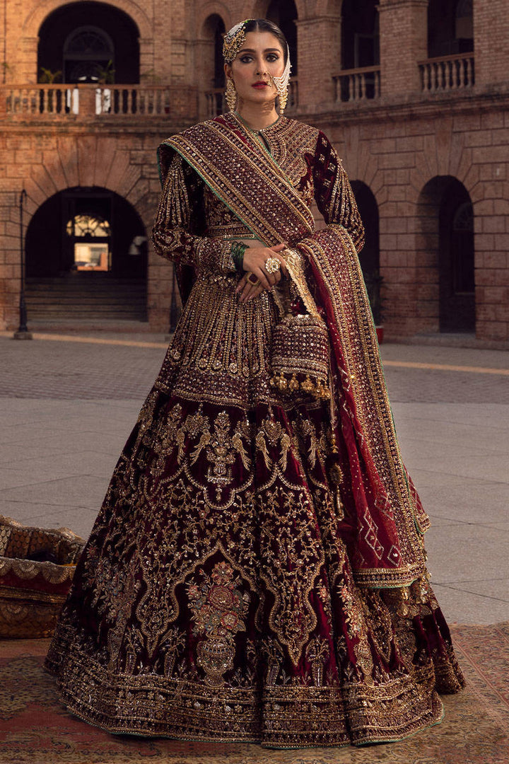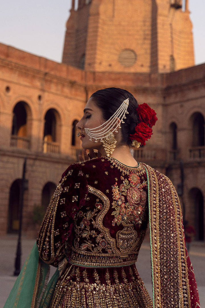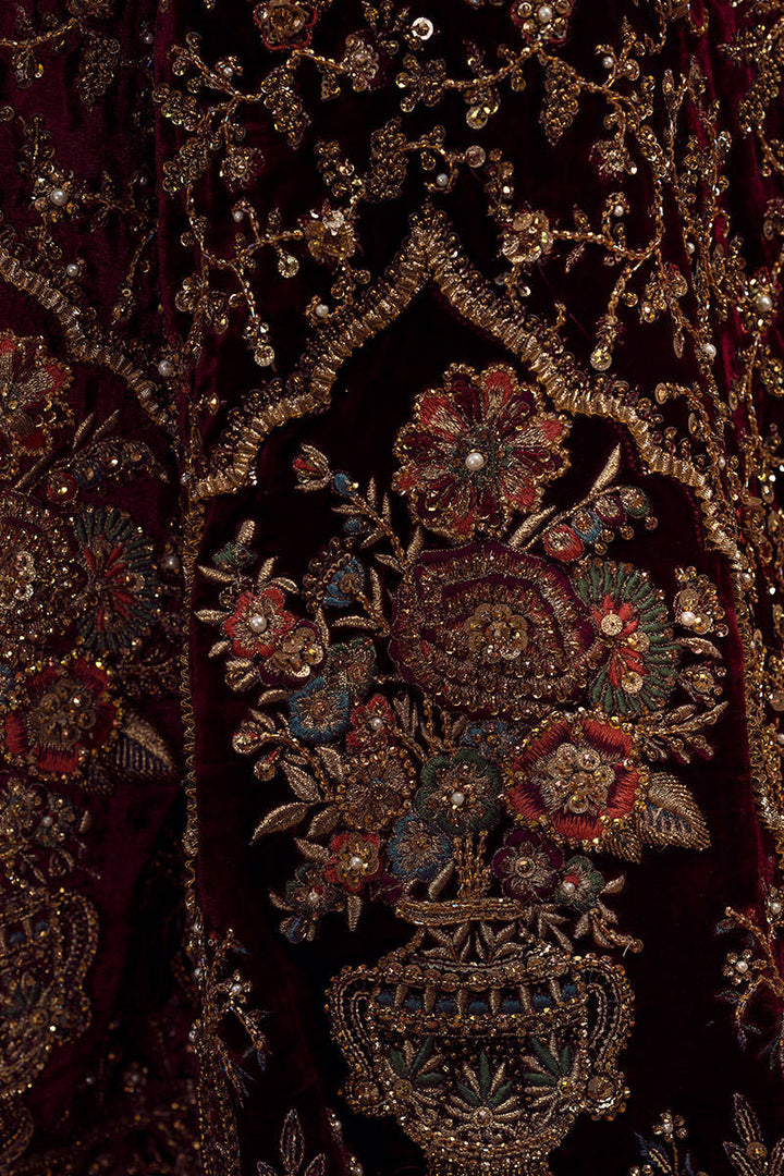 Kaif is our signature rich burgundy maroon colored bridal ensemble that will surely leave you spellbound with his impeccable design. It is adorned with luxurious embroidery that spans from hem to the neckline., the skirt features beautiful floral vases encased in symmetrical niches and accented with beautiful birds and vines.The bodice and sleeves featured intricate linear patterns, it is paired with coordinated marching diaphanous dupatta balancing the ensemble with simpler pairing featuring intricate embroidery along the borders and flirty tassels