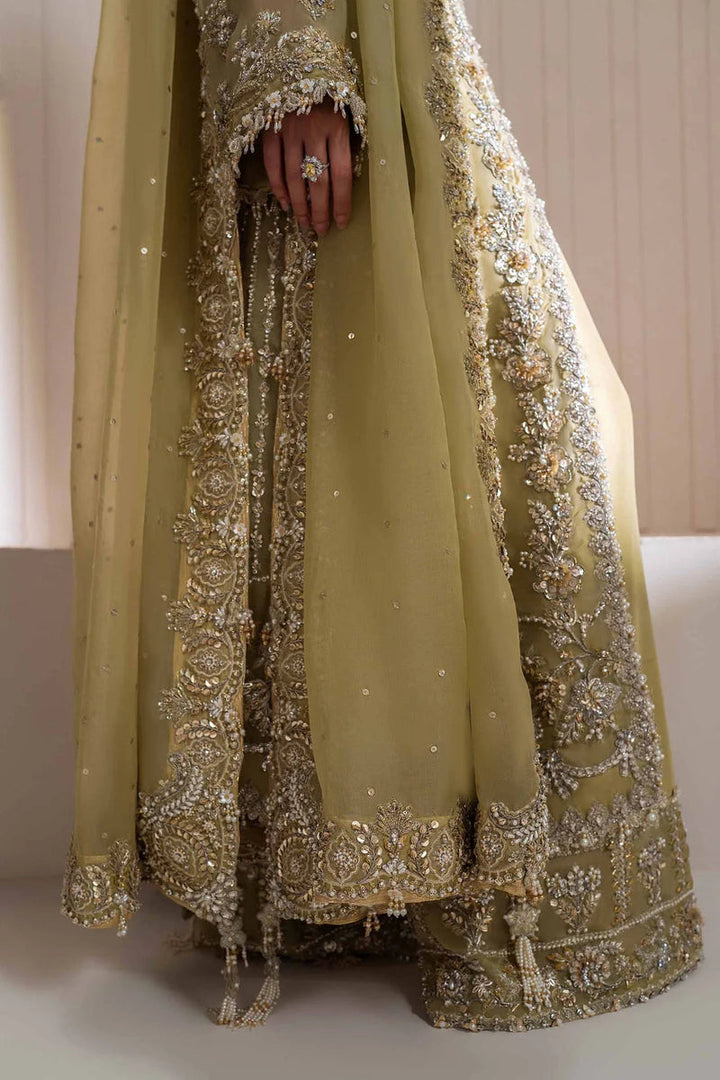 Indulge in the unparalleled splendor of 'Mélodie' where the rich heritage of tradition melds seamlessly with the pinnacle of contemporary luxury upon an ethereal organza canvas. This masterpiece is a celebration of artisanal excellence, adorned with painstakingly handcrafted gotta work and exquisite zardozi embroidery that evoke an air of timeless magnificence. The elongated, front-open silhouette of the shirt exudes regal charm, effortlessly draped alongside a dupatta that glistens with gold dust sequins, embodying an elevated sense of glamour. Completing this regal ensemble, the palazzo pants are enriched with an intricately embellished border of gold dust gota, zardozi, and lustrous pearls, creating a breathtaking contrast that enhances its sublime sophistication and transcendent grace.