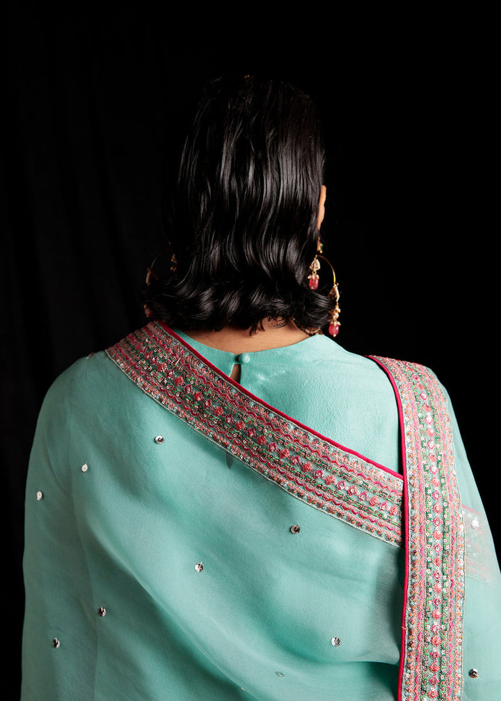 A decent ice blue raw silk shirt with intricately embellished neckline and sleeves at the ends, it is paired with a raw silk mustard shalwar heavily embellished shalwar with intricate, dainty details of silver mukaish, silver nakshi, silver sequins, silver dabka, and orange and pink buggle beads. It comes with an ice blue organza dupatta with multihead borders on all four sides and sequin chatta all over it.