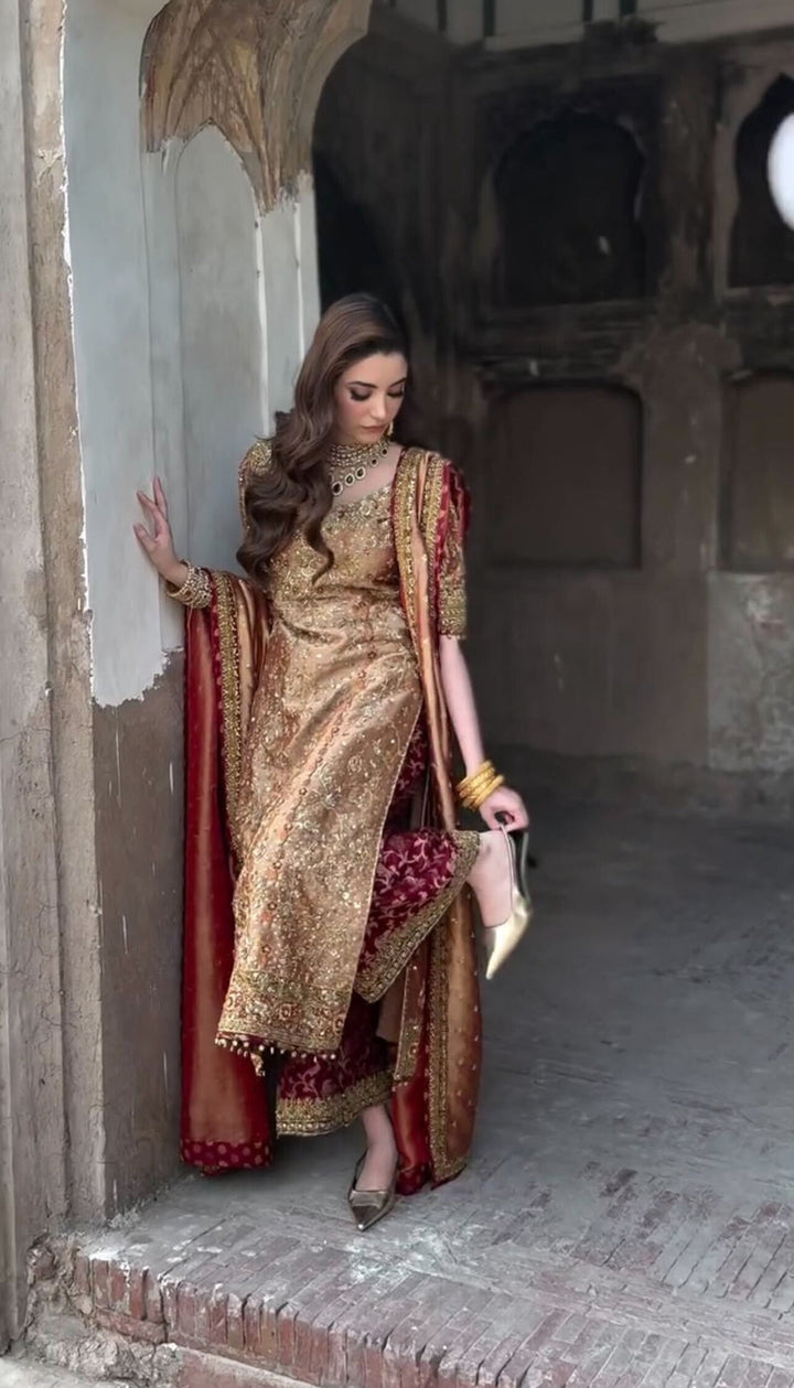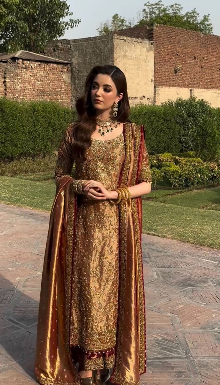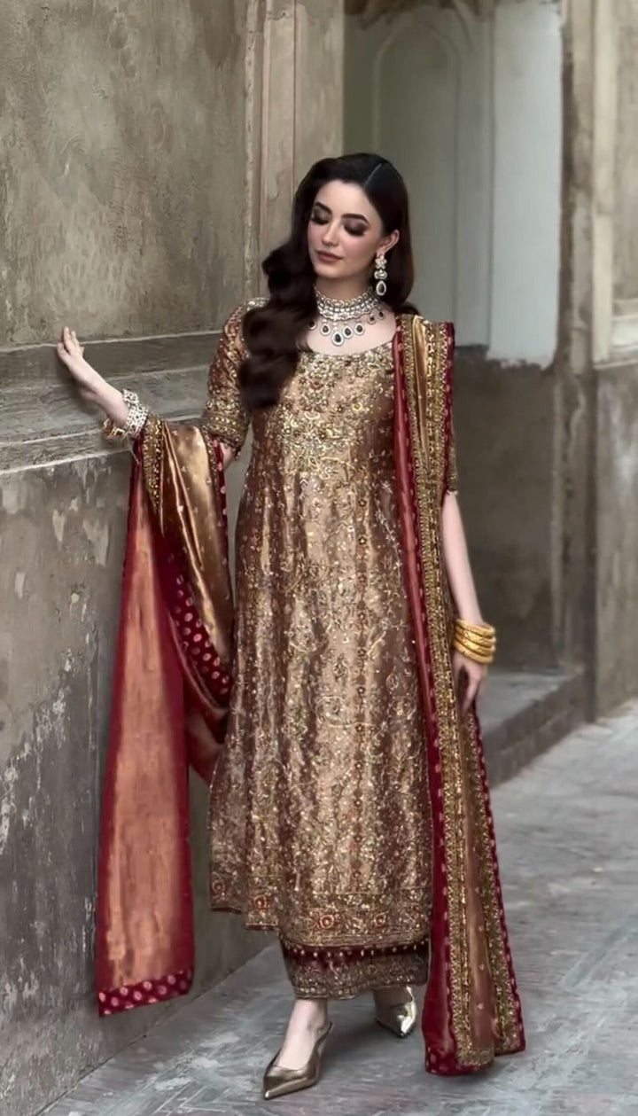 Make a grand statement in this luxurious deep bronze silk ensemble, exuding traditional opulence and timeless elegance. The outfit features delicate gold motifs throughout, complemented by intricate hand-embellished detailing on the hem and neckline. Paired with a rich matching dupatta bordered with embellished accents and subtle maroon piping.