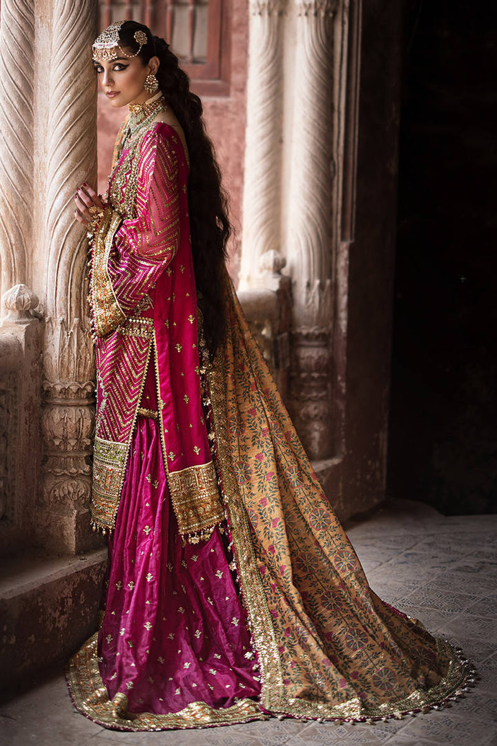Step into the lush and vibrant world of 'Naranji Bagh,' where the ensemble's rani pink and red hues are a testament to its opulent charm. The embroidered organza shirt is a masterpiece, adorned with exquisite hand-embellished pearls, sequin and mirror work, and allover sequin detailing on the sleeves. Two different satin silk borders in parrot green and mustard add a unique and lively contrast.The embroidered gharara, enriched with intricate details and embroidered satin silk border, adds a touch of sophistication to this ensemble. The printed dupatta on cotton slub, adorned with sequin and embroidered four-side satin silk border, completes the picture of timeless elegance. 'Naranji Bagh' is a celebration of color and craftsmanship, ideal for brides who seek an extraordinary and unforgettable look.