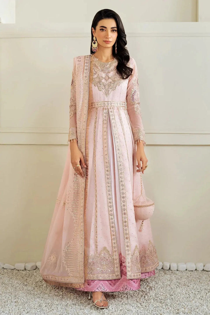 Izna” is an exquisite premium chiffon pastel pink ensemble adorned with intricate gold embroidery and shimmering details adding a contemporary twist, while the embroidered chiffon dupatta and raw silk tonal trousers, adorned with delicate floral motifs, perfectly complete the look.