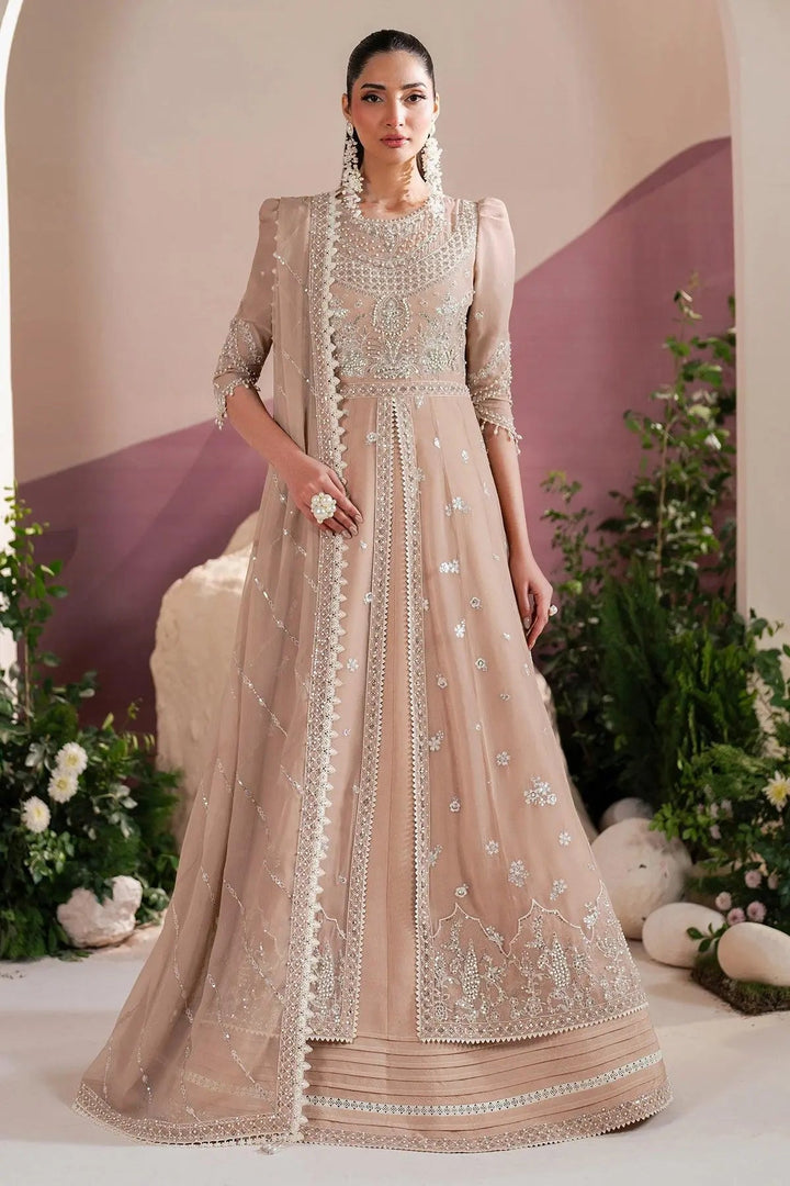 Introducing a new color, Powder Peach featuring a stunning pearl embroidery on a chiffon base, complemented by beautifully embroidered borders and sleeves. This combination exudes sophistication and elegance, paired with dyed raw silk trouser and a chiffon dupatta featuring with embroidered borders.