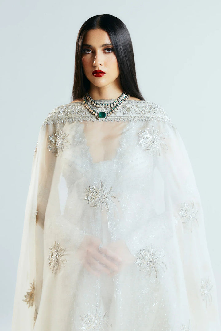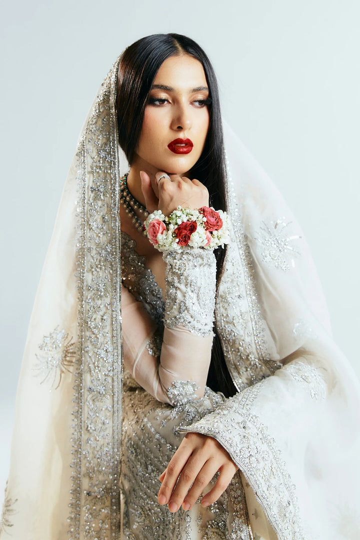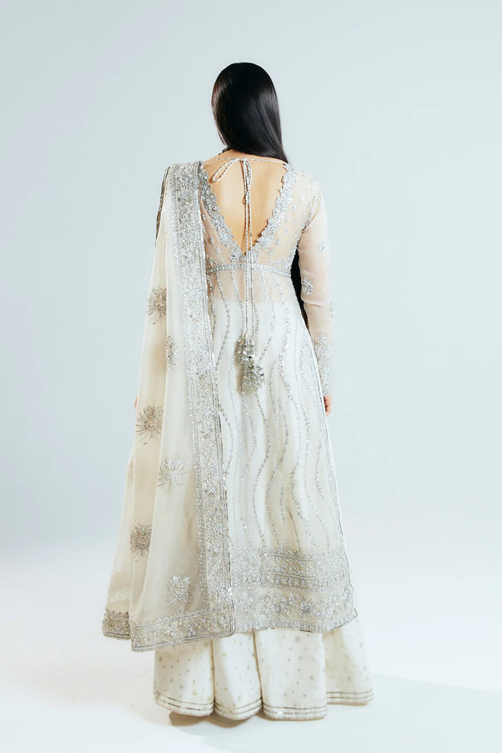 This beautiful ivory outfit definitely makes a style statement. It is paired with foil printed sharara and embroidered dupatta with heavily embellished borders on four sides with sequins, cut dana and with nakashi, dabka, making it a stellar piece.