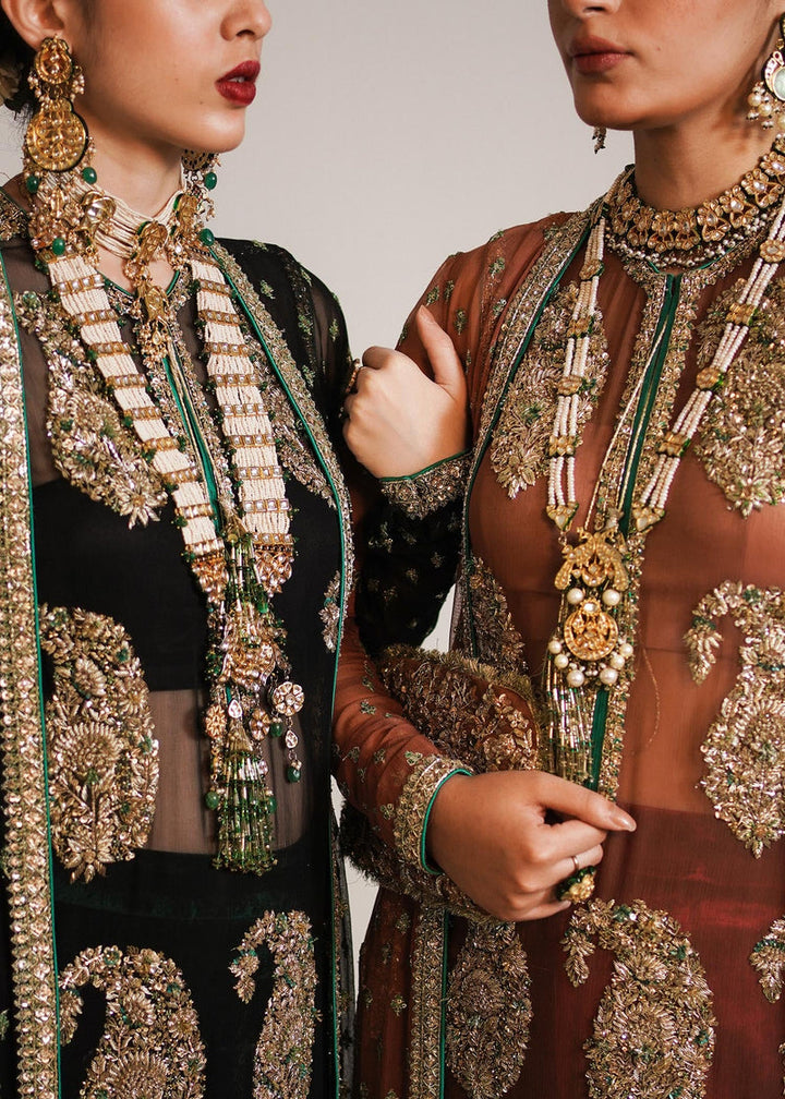 Exuding elegance is this pretty rusty brown chiffon floor length shirt intricately embellished with gold adda work of naqshi, dabka, sequins and multicolored cutdana paired with a beautiful chiffon gown adorning light chatta of sequins. This chic and sleek outfit comes with a plain satin silk bustier and velvet palazzo pants finished beautifully with a lappa at the hem.