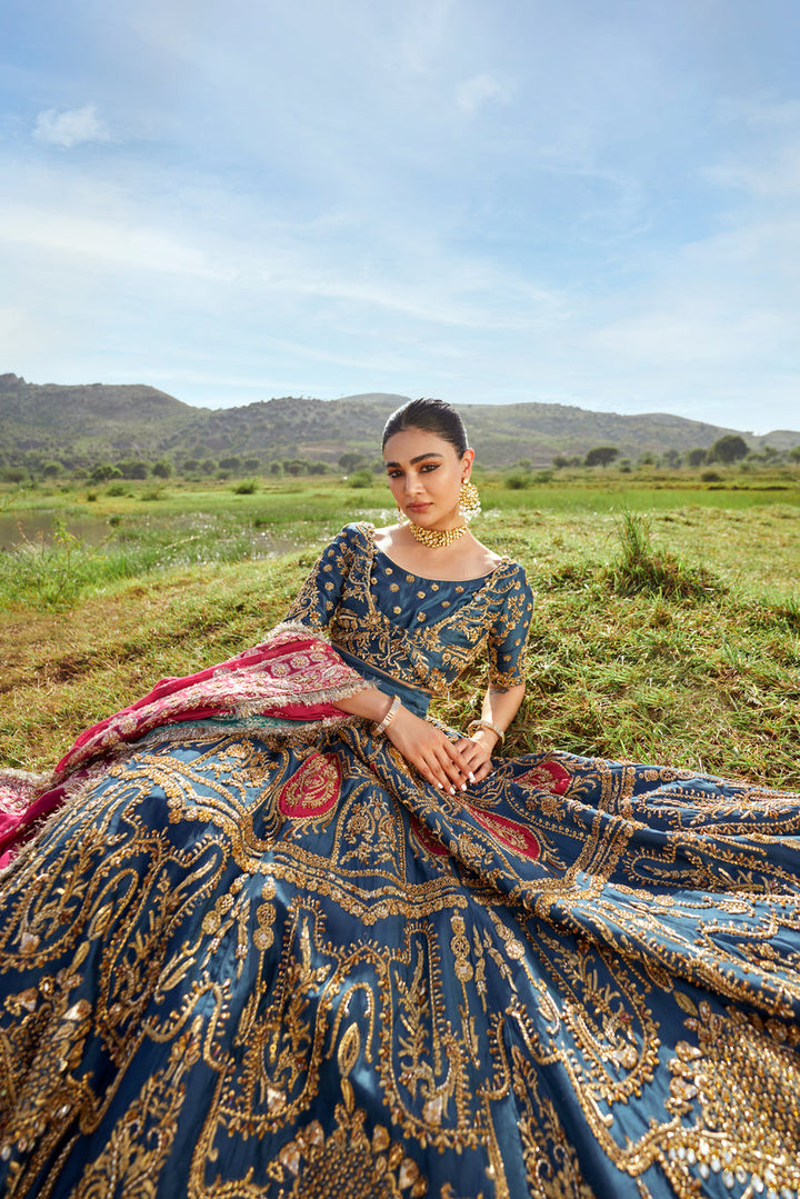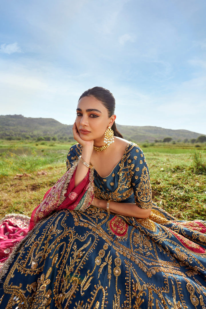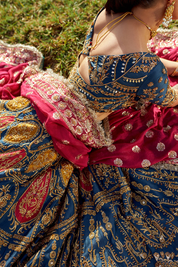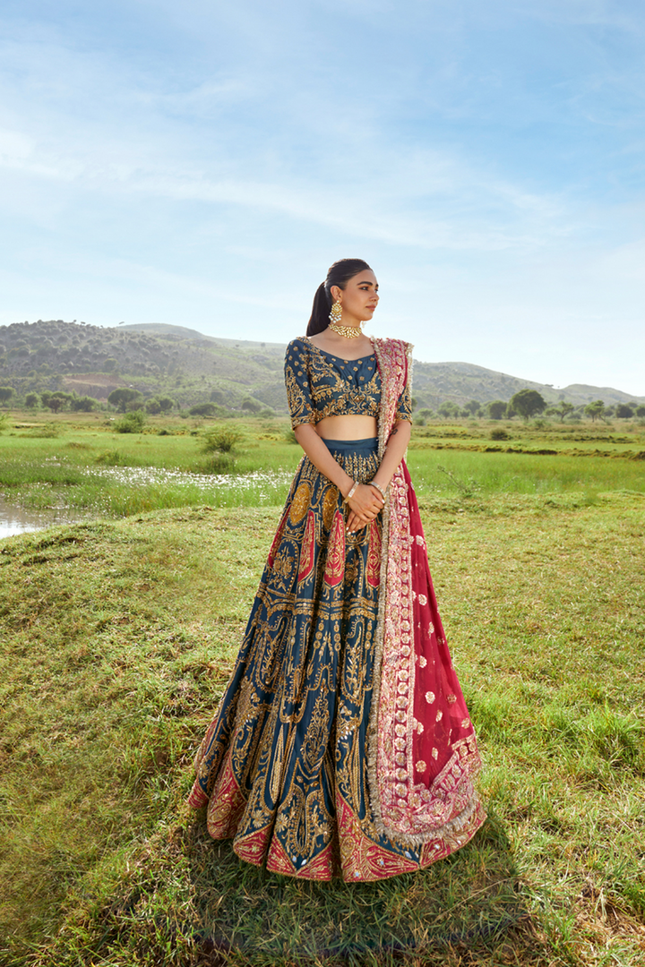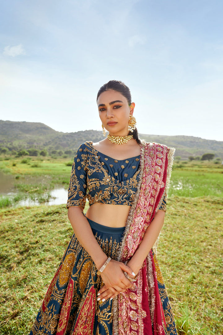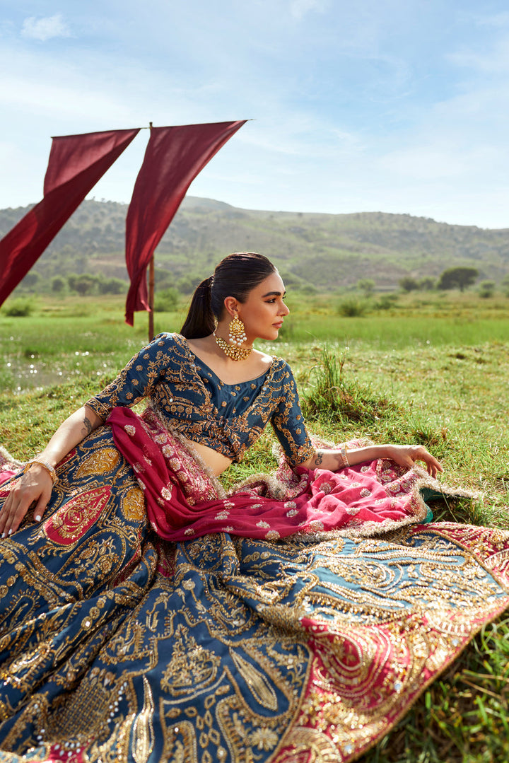 A tusser silk lehenga and a choli set of an admiral blue hue splashed with fuschia and yellow intricacies, and golden handwork. A fuschia pink zari organza dupatta with with heavy embellishments makes this look perfect.