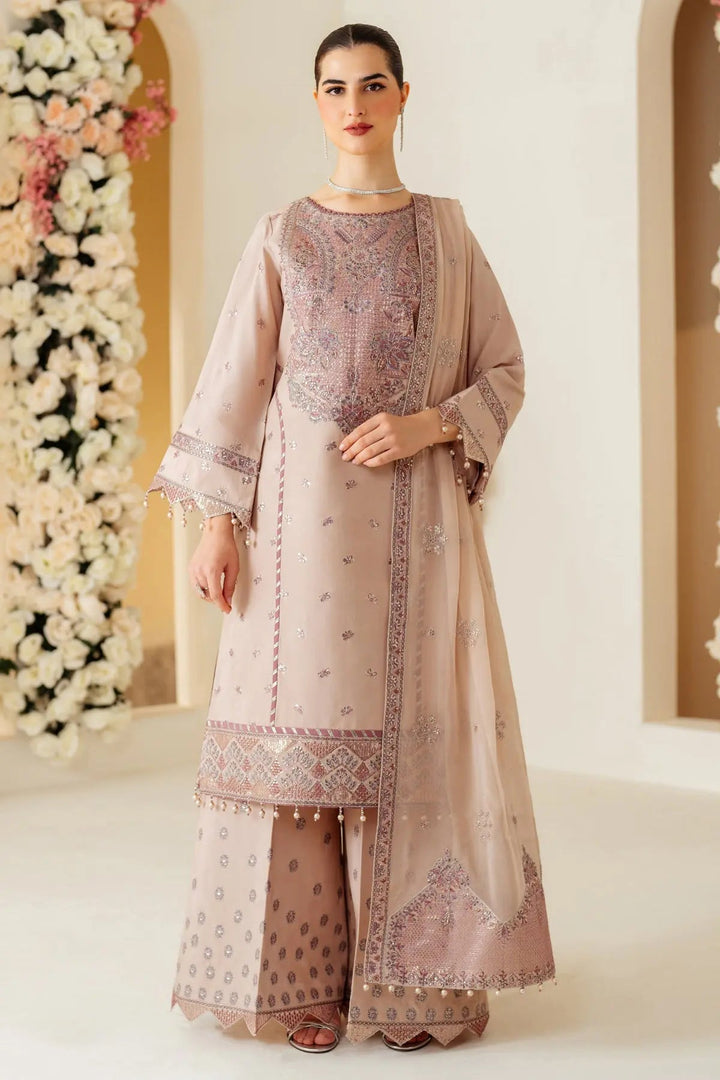 Taffy is an exquisite raw silk ensemble in a soft dusty pink, featuring intricate embroidery along the neckline and sleeves. It is gracefully paired with embroidered raw silk trousers and chiffon dupatta with contrasting threadwork, creating a subtle effect that makes it perfect for special occasions.